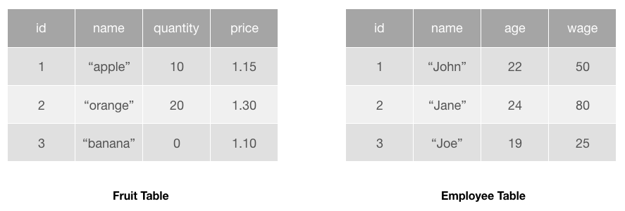 A database is a collection of information organized so that it can be easily accessed, updated, and managed. This is executed with a collection of tables. Each column represents a specific piece of information you wish to store and has a defined data type. Each row contains a set of values corresponding with each column. A row represents a singular item. Example: A grocery databaseThis database contains two tables, perhaps named fruits and employees. Both tables contain three rows (also referred to as records or tuples) and four columns (also referred to as fields or attributes).
