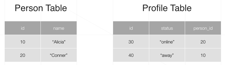 Each profile row has its own primary key id, a status, and a foreign key person_id referencing the person that has that profile. In this example, the profile with id = 30 belongs to the person with id = 20, which is Conner.