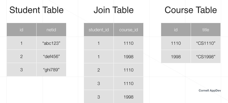 This new table Join, like its name implies, serves to join together students with courses. Each row in Join represents a relation between the student with Student.id = Join.student_id and the course with Course.id = Join.course_id. For example, the student with id = 1 is present in two rows in Join: one with course_id = 1110 and one with course_id = 1998. This tells us that student abc123 is enrolled in CS1110 and CS1998. On the other side, the course with id = 1110 is present in 3 rows in Join with its associated student_id being 1, 2, and 3 respectively. Then we know that the course CS1110 has students abc123, def456, and ghi789 enrolled in it.